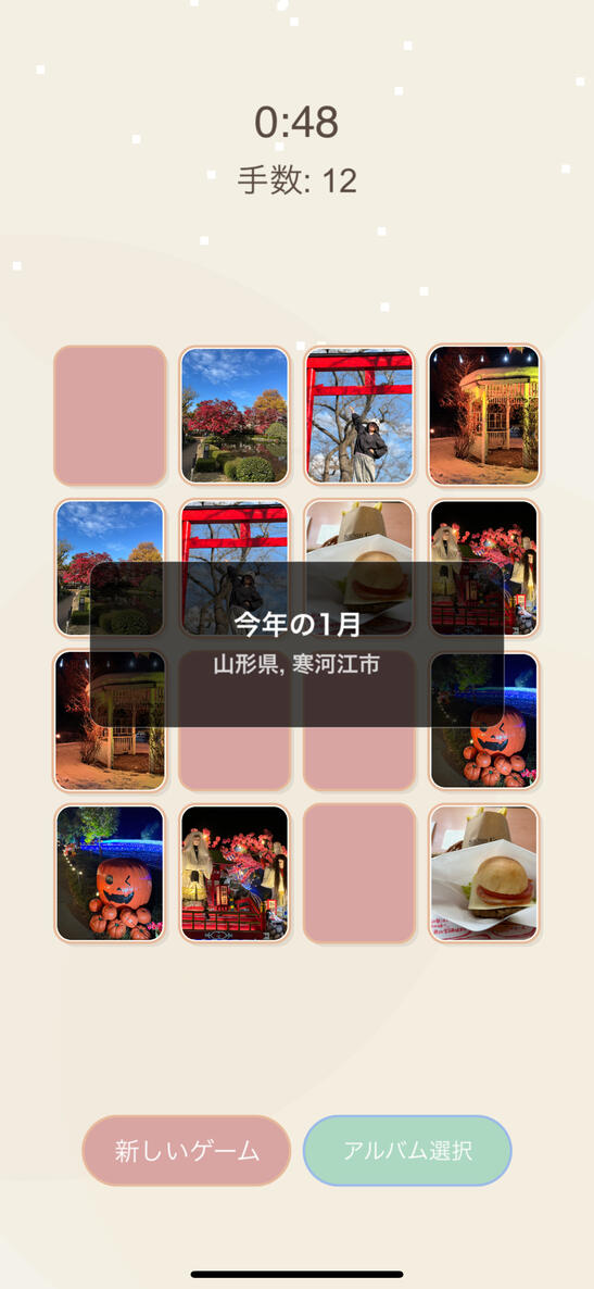 カードをマッチすると、その写真の撮影場所や日付が表示されます。ゲームを通じて思い出がより鮮やかに蘇ります。